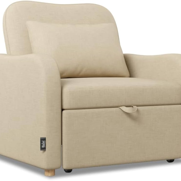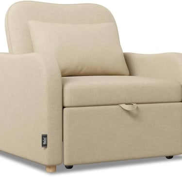 Nalui-Sofá Cama 1 Plaza 3 en 1 Buddy 92x97x90cm con Respaldo Ajustable 2 Posiciones y Almohada. Sofá Cama Individual de Lino, Soporta hasta 200Kg. Sillón Relax Reclinable con Reposabrazos, Beige