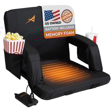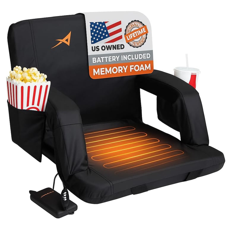 Asientos de estadio con calefacción para gradas con soporte para la espalda, batería USB incluida, 3 niveles de calor mejorados, silla plegable, acolchada, 4 bolsillos para aperitivos, portavasos,