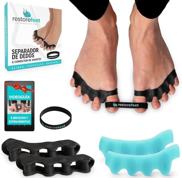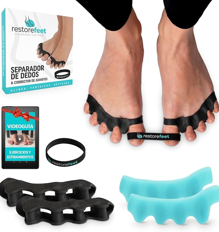 RestoreFeet Separadores de Dedos de los Pies, (2 pares) + Banda Anti-Juanetes para Enderezar los dedos Torcidos o Superpuestos - Separador dedos pie, corrector de dedos, 0% BPA