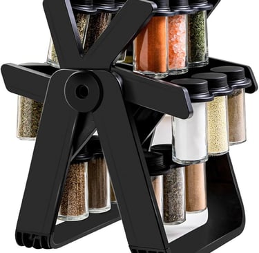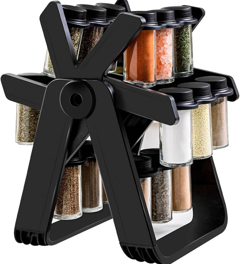 Organizador de Especias Giratorio con 18 Tarros de Especias de Cristal, Juego de Especias Giratorias, Rueda de la Fortuna Giratoria de 360°, Organizador de Condimentos para Encimera de Cocina(Negro)